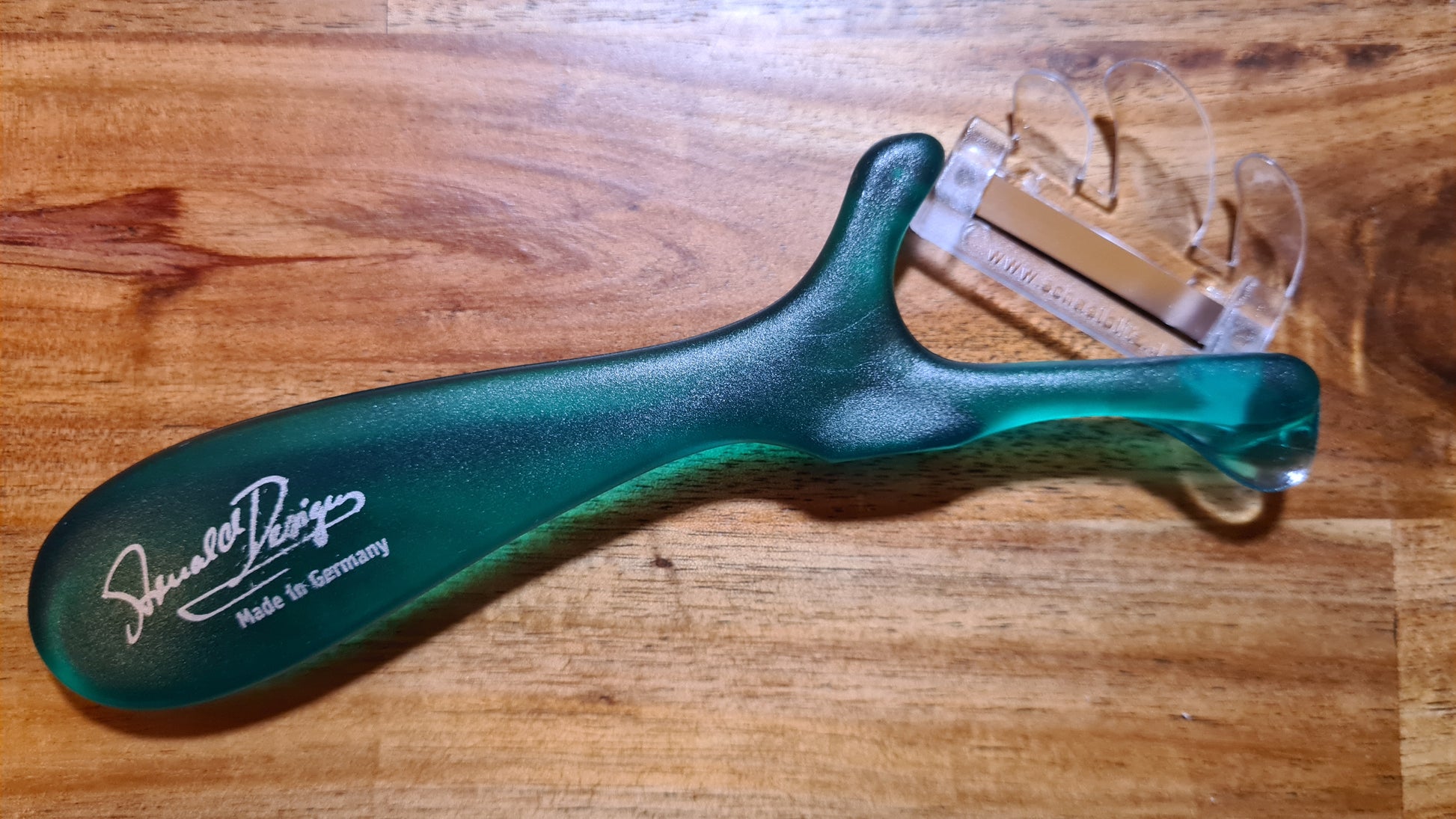 - Der Schäler wird in Deutschland aus hochwertigen Kunststoffen (ABS & Polycarbonat) aus der Medizintechnik hergestellt. Die Solinger Klinge aus rostfreiem Stahl ist abgezogen und hat, für lange Standzeit, eine Harte von 56 Rockwell. Der Schäler ist in verschiedenen Farben sowohl für Rechts- als auch Linkshander lieferbar.